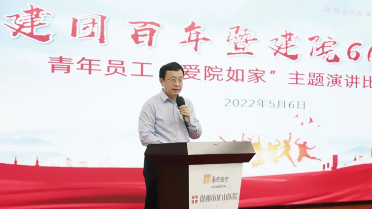 党委书记乔向华致辞,他指出,近年来,矿山医院广大青年以“践行初心、担当使命”的博大情怀、“敬佑生命、甘于奉献”的新时代卫生职业精神,在医疗救治岗位发光发热;以“生命至上、舍生忘死”的伟大抗疫精神,在疫情防控一线逆行坚守,彰显了青春的蓬勃力量。乔向华书记希望通过此次“爱院如家”主题演讲活动,让广大青年牢记使命,把理想信念根植于心,不断增强“四个意识”,坚定“四个自信”,做到“两个维护”,不负青春,踔厉奋发,积极投身到医院高质量发展的火热实践中去。